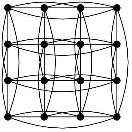 This time, we had to change far fewer edges and the second graph looks prettier. For $ {m=2}$ GM switching and WQH switching always yield isomorphic graphs, so we cannot actually obtain new graphs this way. The true usefulness of WQH switching comes for $ {m>2}$. Again, we can provide the adjacency matrices. Here for $ {K_4\times K_4}$ we have still have the following adjacency matrix: