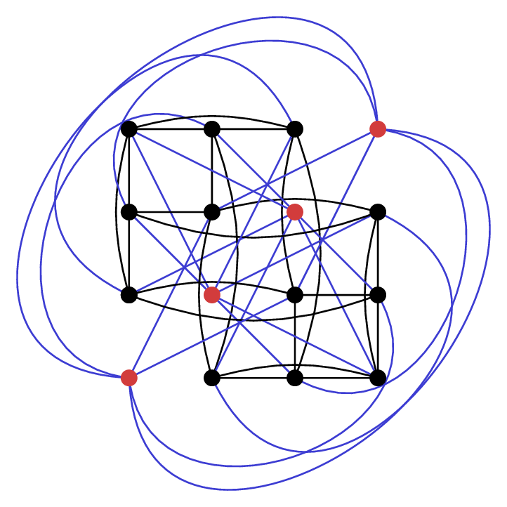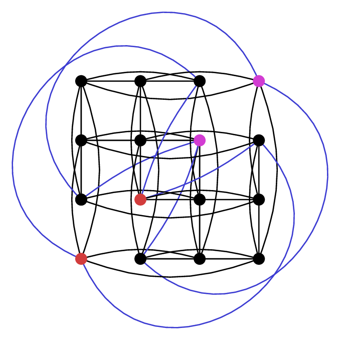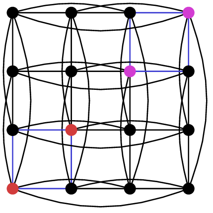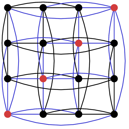 Let’s call this WQH switching. Similar to Godsil-McKay switching, we can apply WQH switching to $ {K_4 \times K_4}$ to obtain the Shrikhande graph. Here $ {C_1}$ is in red and $ {C_2}$ in blue.